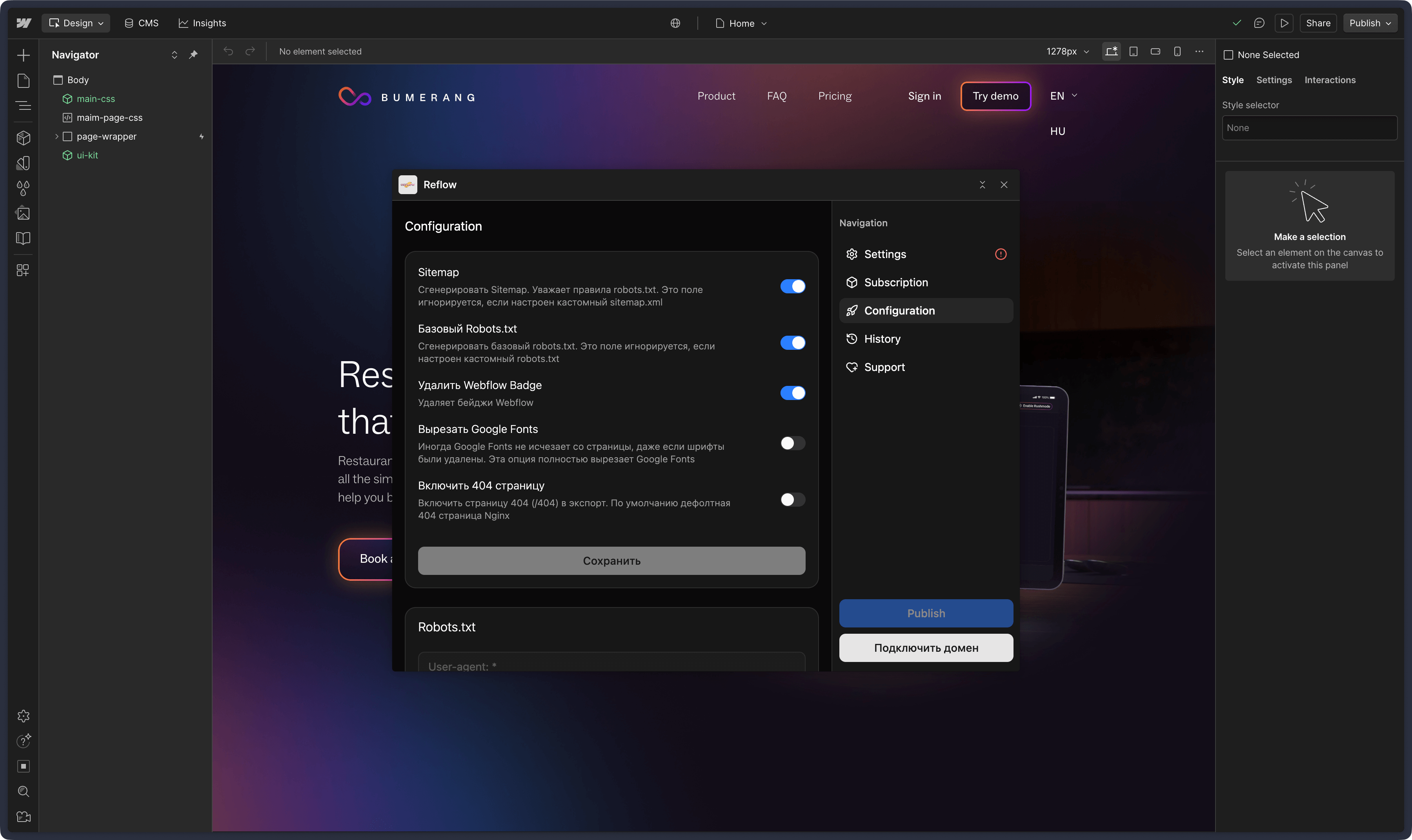 CMS Коллекции, пагинации, редиректы, sitemap и robots.txt. Все возможности Webflow работают без ограничений.